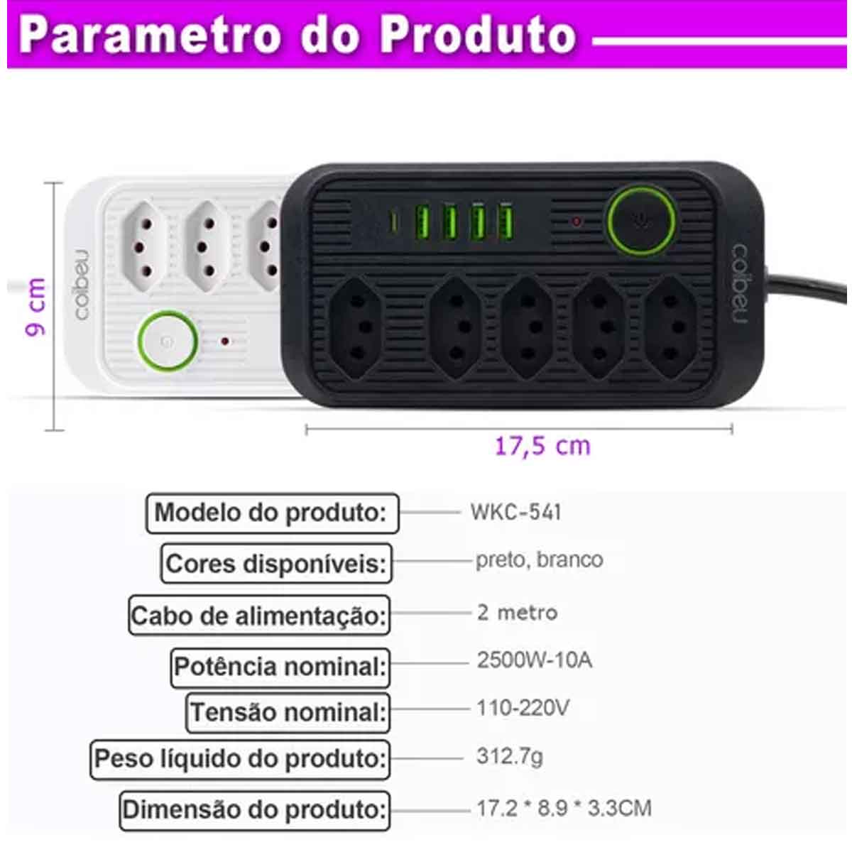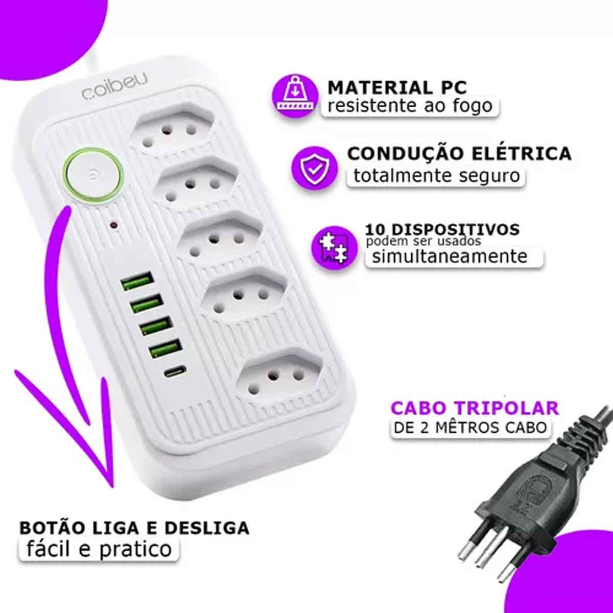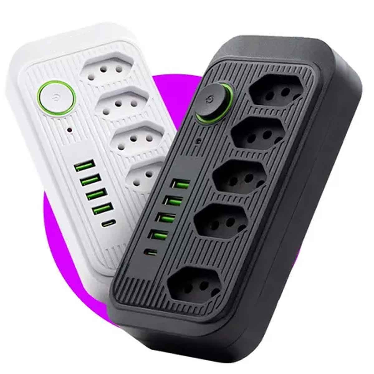 Características: LED indicador, tomadas e portas USB de alta eficiência, design compacto