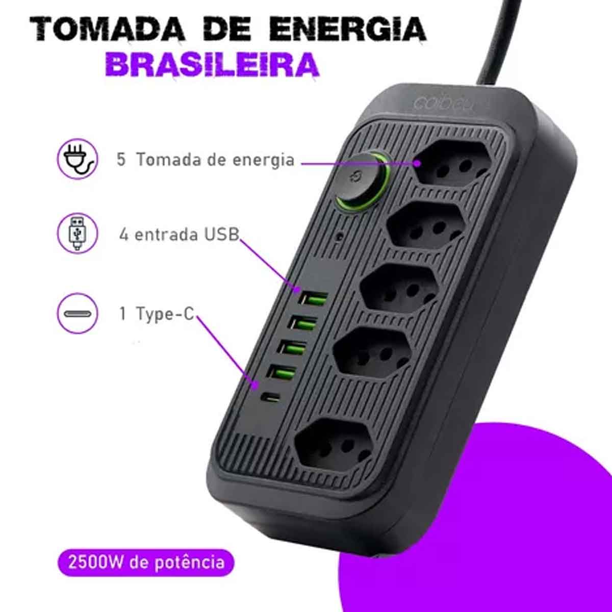 Tipo: Extensão elétrica com 5 tomadas e 4 portas USB