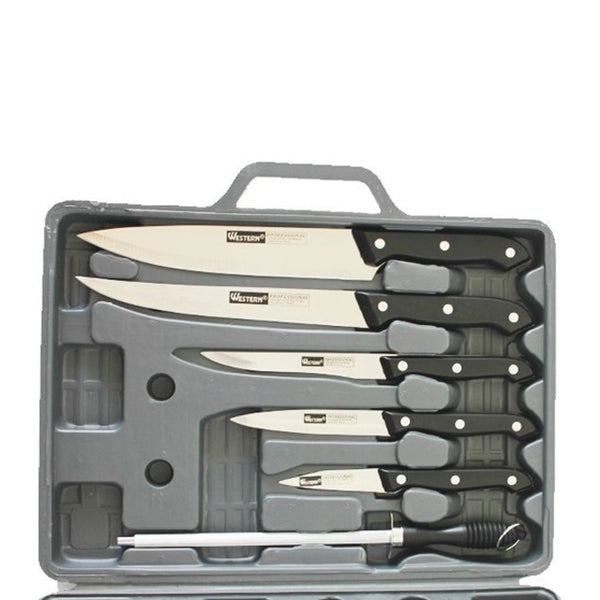 - 01 faca para legumes (18 cm) - 01 faca de cozinha (22,2 cm) - 01 faca para desossar (24,1 cm) - 01 faca trinchante (32,7 cm) - 01 faca para peixes (32,5 cm) - 01 chaira para afiar/amolar facas (29,1 cm) - 01 Maleta - 01 Tábua de carne